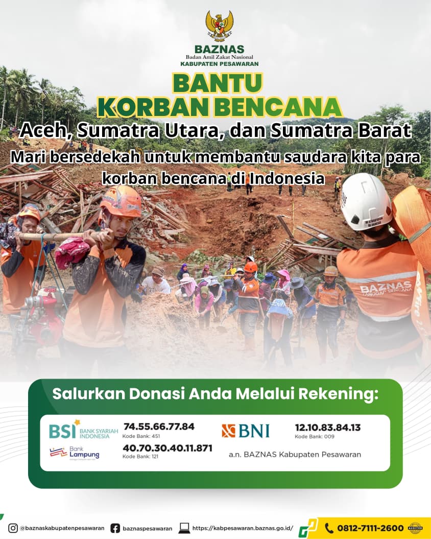CAHYAMEDIA (PESAWARAN) – Kepedulian dan semangat ukhuwah Islamiyah terus ditunjukkan oleh Badan Amil Zakat Nasional (BAZNAS) Kabupaten Pesawaran sebagai badan resmi pemerintah, bersama Majelis Taklim (MT) Miftahul Jannah Desa Hanura melalui kegiatan penggalangan Zakat, Infak, dan Sedekah (ZIS) kemanusiaan bagi para korban bencana alam di Provinsi Sumatera Utara, Sumatera Barat, dan Aceh.