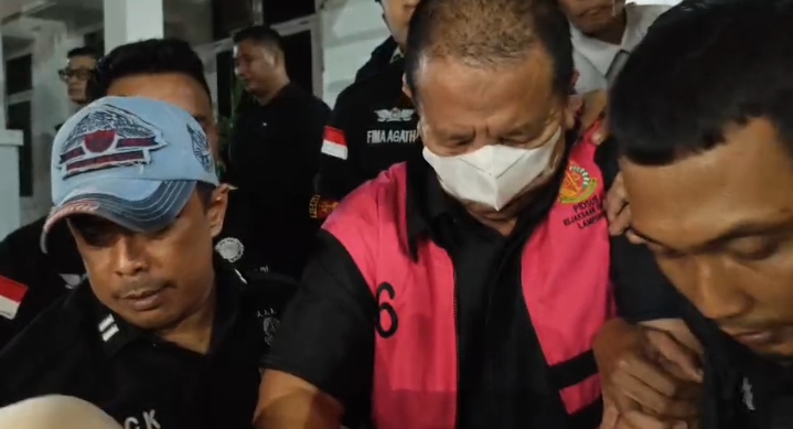 Mantan Gubernur Lampung Periode 2019-2024 keluar Gedung Kejati Lampung memakai rompi tahanan warna oranye dengan tangan diborgol dan wajah pakai masker pada pukul 21.20 WIB. Arinal menundukan wajah dari jepretan kamera puluhan wartawan.