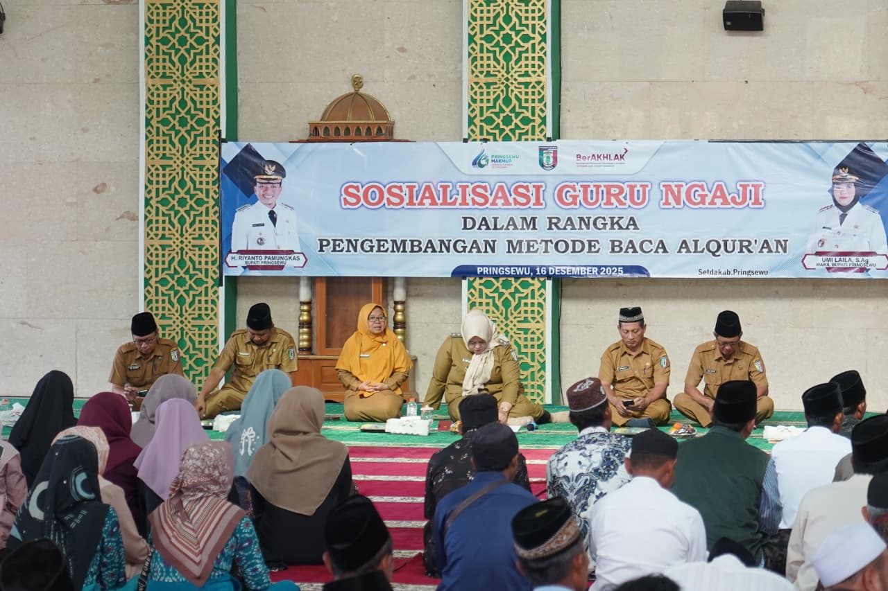Komitmen tersebut diwujudkan melalui pelaksanaan Sosialisasi Pengembangan Metode Baca Al-Qur’an bagi guru ngaji se-Kabupaten Pringsewu Tahun 2025 yang digelar di Masjid Agung Al-Asma’ul Husna, Islamic Center Kabupaten Pringsewu, Selasa (16/12/2025).